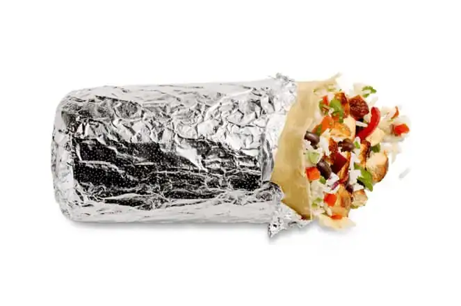 Grilled chicken wrapped in a warm flour tortilla with white rice, pinto or black beans, tomato salsa, roasted corn salsa, sour cream, fajita veggies, cheese, and romaine lettuce.