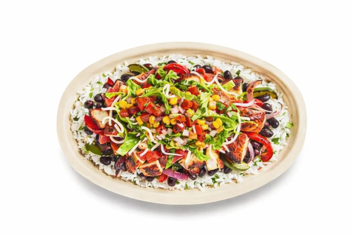 Grilled chicken served over white rice with pinto or black beans, tomato salsa, roasted corn salsa, sour cream, fajita veggies, cheese, and romaine lettuce.