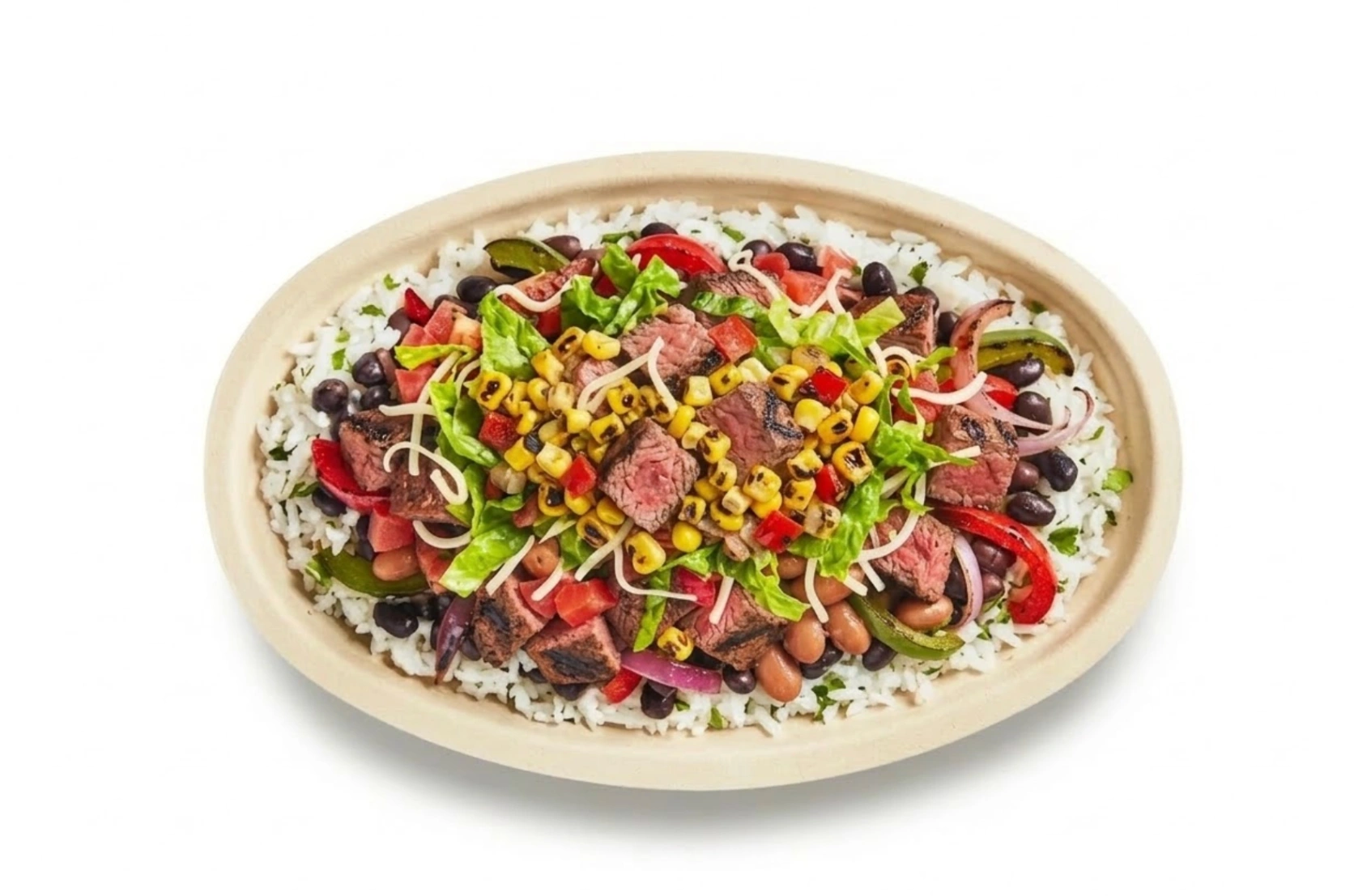 Grilled steak served over white rice with pinto or black beans, tomato salsa, roasted corn salsa, sour cream, fajita veggies, cheese, and romaine lettuce.