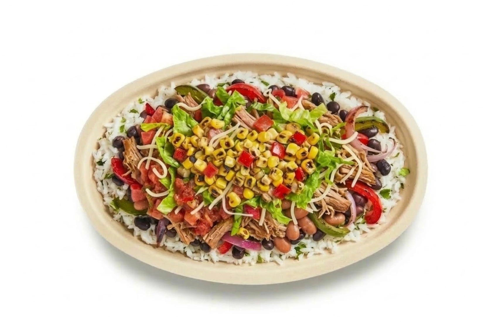 Slow-braised carnitas served over white rice with pinto or black beans, tomato salsa, roasted corn salsa, sour cream, fajita veggies, cheese, and romaine lettuce.
