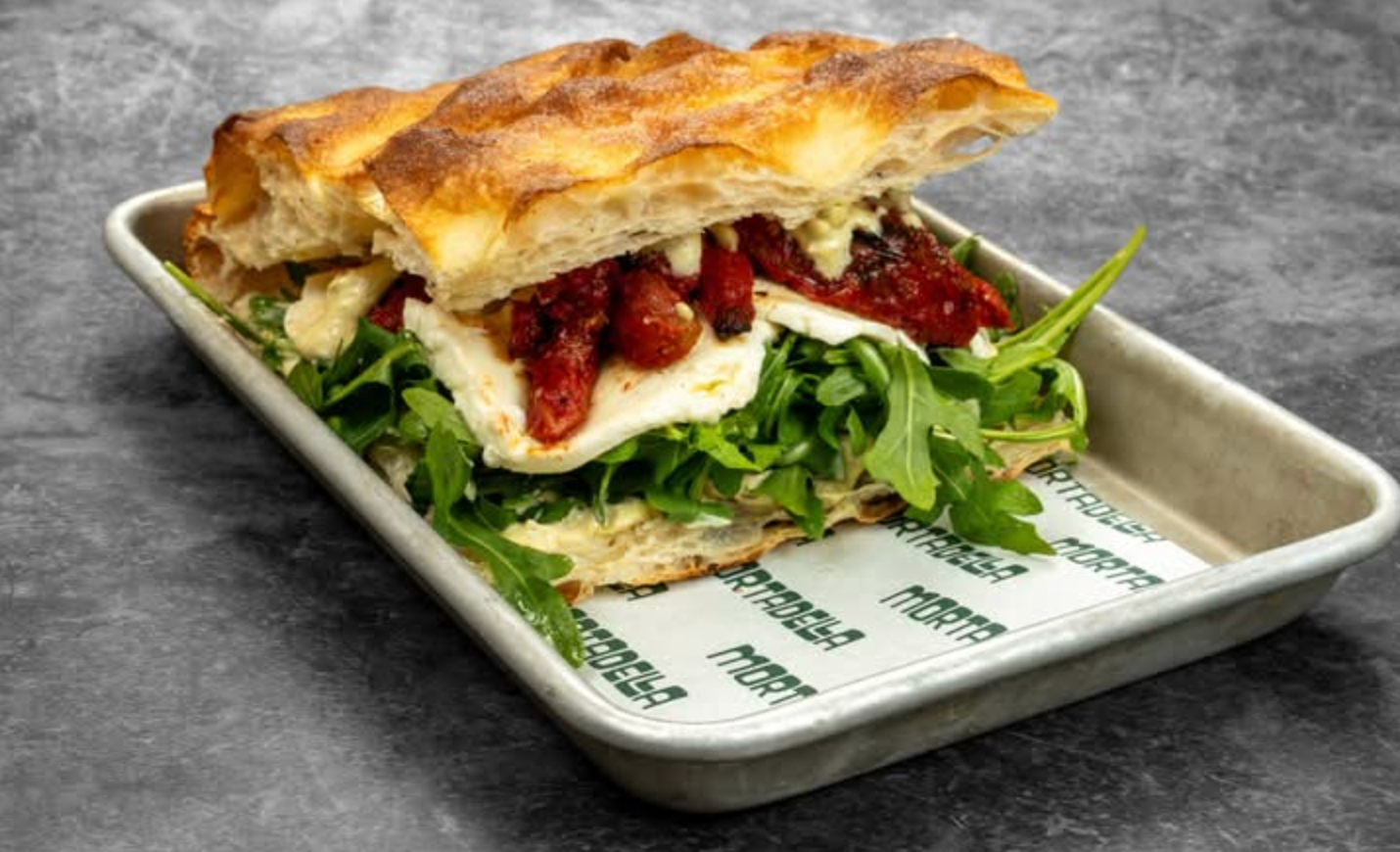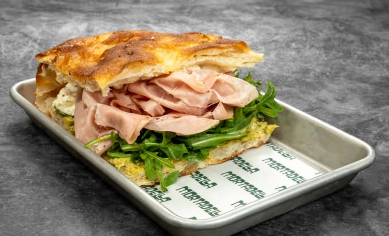 Sandwich with stracciatella, mortadella, pistacchio, arugula