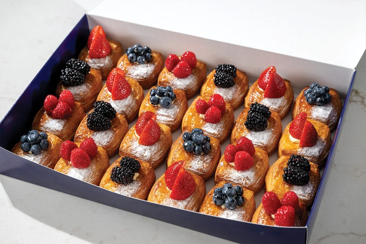 (Serves 12) A selection of our favorite mini pastries (two/person). Includes Strawberry Lemon Cream Croissant, Mini Grain Cream Cheese Pastry, Mini Croissant, Mini Feuillete au Chocolat, and Pastel de Nada.