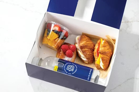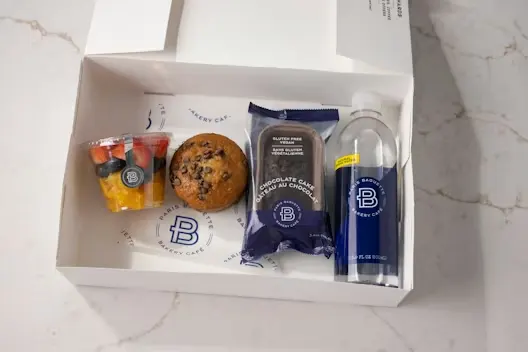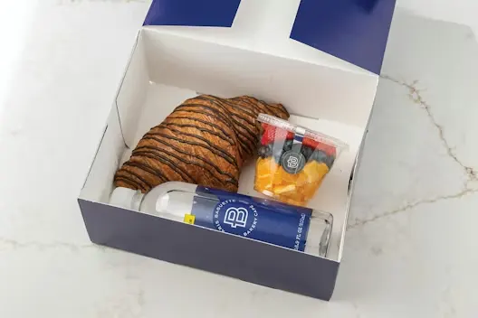 Includes your choice of Pastry (Almond Pastry, Chocolate Croissant, Coffee Bun, Butter Croissant, Pain Aux Raisin or Twisted Donut), Fruit Cup and a choice of Bottled Water or Juice (Apple or Orange)