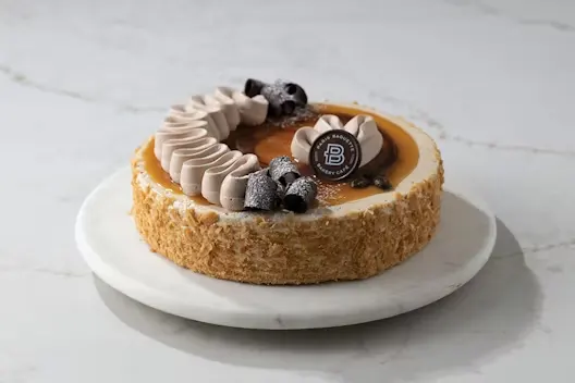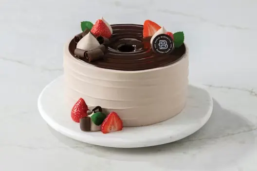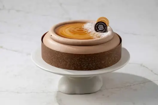 (Serves 10) Three layers of chocolate sponge filled with chocolate mousse soft cream and salted caramel sauce, wrapped in a chocolate belt.