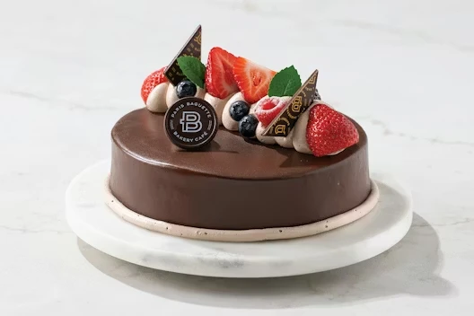 (Serves 8) Chocolate cake with chocolate buttercream, coated in chocolate, topped with berries