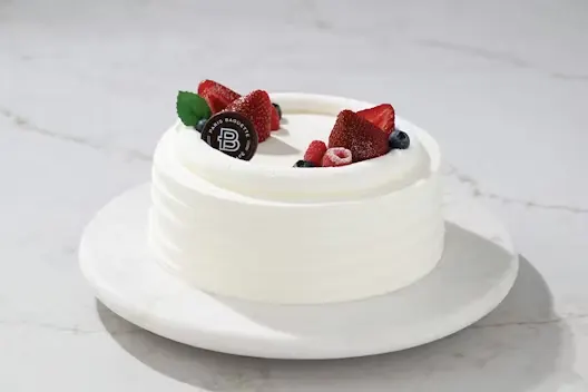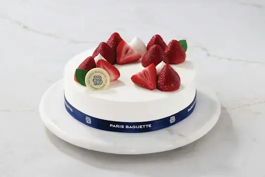 (Serves 10) Vanilla cake filled with soft cream and fresh strawberries, topped with more berries.