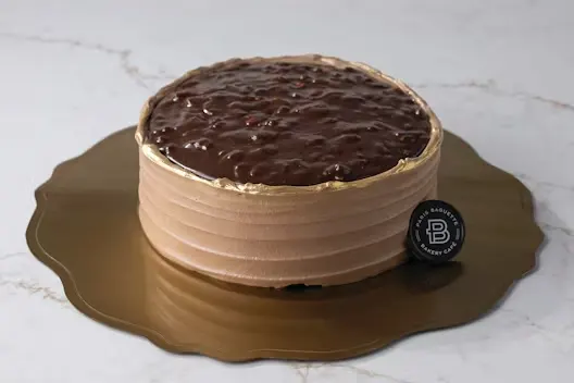 (Serves 8) Rich chocolate cake layered with Irish Cream-chocolate mousse; topped with a chocolate ganache crunch and dusted with edible gold.