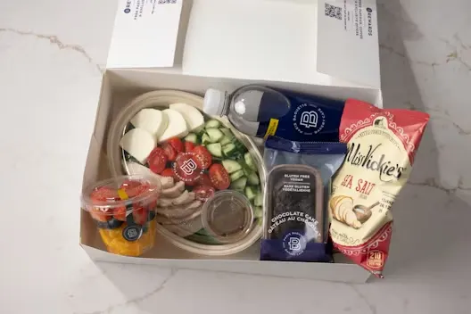 Each individual box includes a Caprese Salad, your choice of gluten-free vegan mini loaf, fruit cup, bag of chips, and choice of drink.