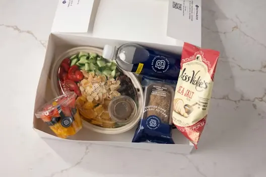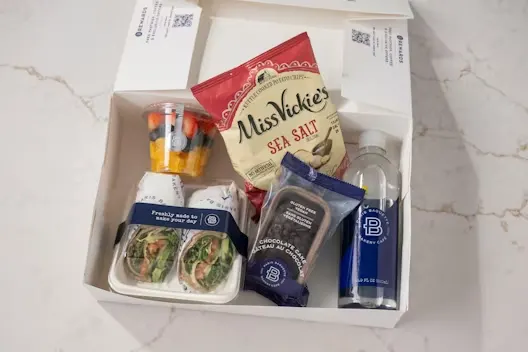 Each individual box includes a Vegetarian Wrap, gluten friendly coffee or double chocolate chip cake, fruit cup, bag of chips, and choice of drink.