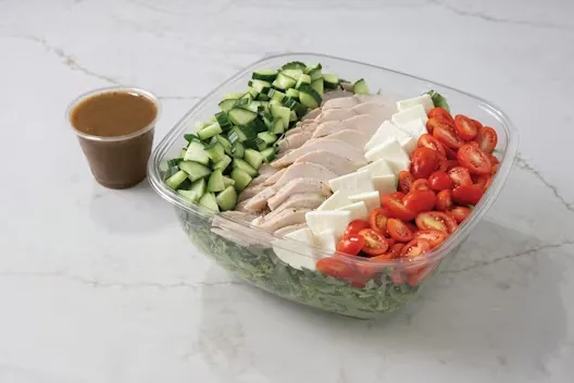 (Serves 12) Grilled chicken, fresh mozzarella, cucumbers, and grape tomatoes on a bed of mixed greens and arugula with balsamic dressing.