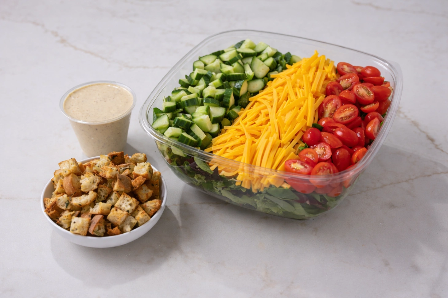 (Serves 12) Cucumbers, grape tomatoes, cheddar cheese, and house made croutons on a bed of green leaf lettuce with honey mustard dressing.