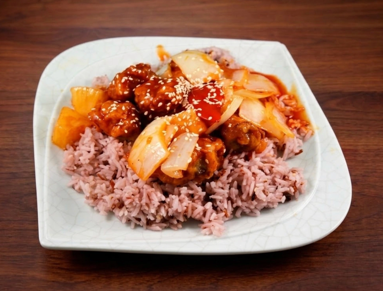 Crispy battered chicken tossed in a tangy tomato-based sauce served with rice