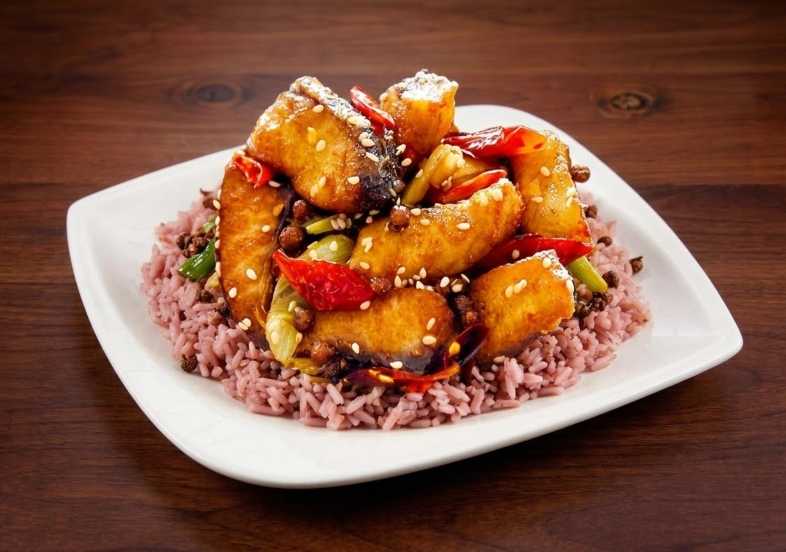 Crispy basa fish tossed in a chili garlic sauce served with rice