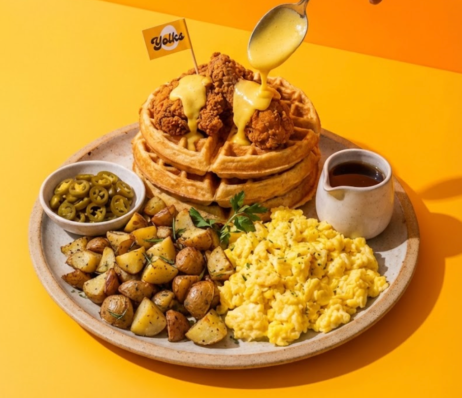 (Serves 1) An indulgent choice featuring Yolks' signature Fried Chicken and Waffles served with Scrambled Eggs, Truffle Lemon Potatoes, Pickled Jalapenos & Maple Syrup (Minimum 20 People)