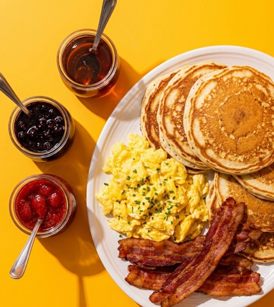 (Serves 1) Family-style Pancake Platter with a delicious breakfast spread of Scrambled Eggs, Bacon & Syrups (Blueberry Compote, Strawberry Compote or Maple Syrup)